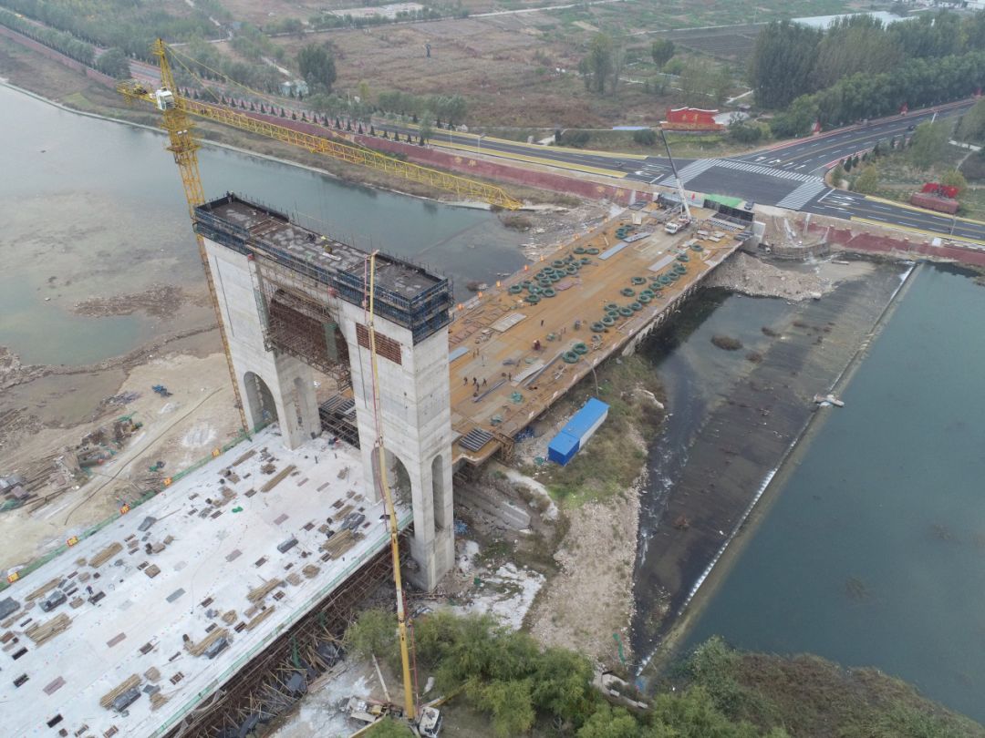 其次科学部署,安排得当。项目现场负责人魏冬介绍说:“这项工程最大特点就是时间紧任务重,对于我们企业,这属于一个陌生的业务领域,难度大。”在合同总工期的要求下,工程技术总院领导和项目部开展两级部署,“在保证安全和质量的前提下,进度就是项目管理的核心,必须确保业主的工期节点。”涉县大桥项目经理部人员立即进入施工状态。项目部制定整个工程阶段性目标,以箱梁和主塔为两个独立阶段进行工期划分,又将箱梁细分为钢箱梁和混凝土箱梁,水平相向施工,同时主塔独立进行施工,以中塔柱八根实心柱柱顶标高为工期节点竖向量化考核,施工计划详细到每一天,每个阶段的目标非常明确。”现场东西两岸同时施工,形成你追我赶的气势,不断掀起施工高潮。管理人员分区负责,技术人员跟踪监控,工序环环相扣,形成良性循环。6月29日,第一根桩基础混凝土灌注完成;8月10日,第一个承台混凝土灌注完成;8月20日,竖起第一根墩柱;9月12日,第一钩钢箱梁横贯河面;11月26日完成第一联四跨现浇箱梁的浇筑……施工按计划快速向前推进,东西两岸的施工更加证实了项目部快速应战的能力。