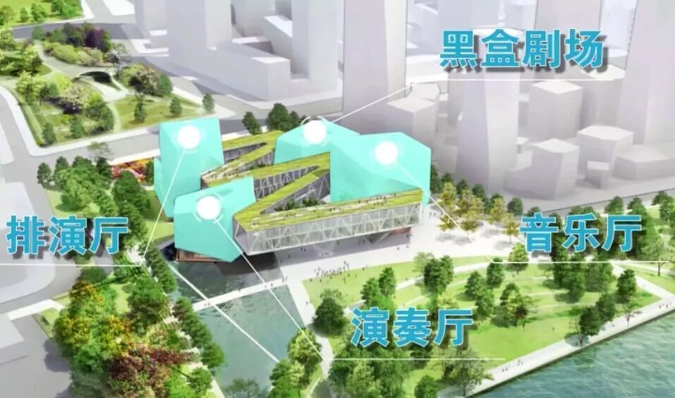 整体建筑体现悬浮式设计理念,音乐厅、演奏厅、排演厅及黑盒剧场,均为不规则多面体,单体间由五条大跨度连廊相互贯通,底层通透的“茱莉亚幻想”公共大厅为开放式共享空间,与海河景观完美的融为一体,整个建筑设计新颖、造型独特。