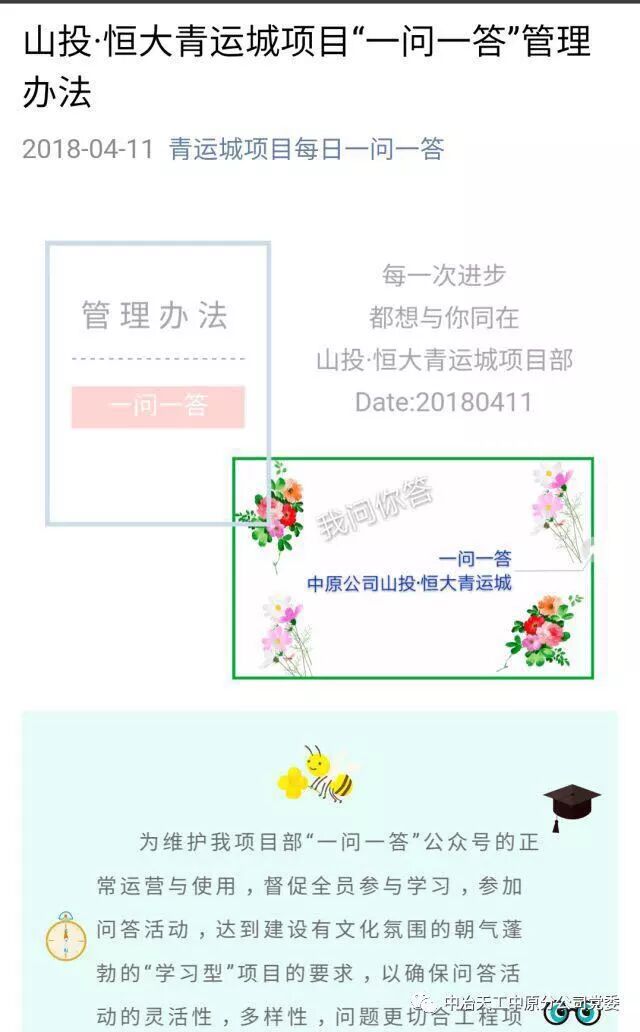 项目部开创了“一问一答”的学习模式,制定《一问一答管理办法》,充分利用“青运城项目每日一问一答”微信公众平台,项目全员轮流发布内容涉及公司各项管理制度及安全、质量等方面的各类管理问题,并于次日公布答案,号召广大员工积极参与质量安全管理,互相学习、共同提高。