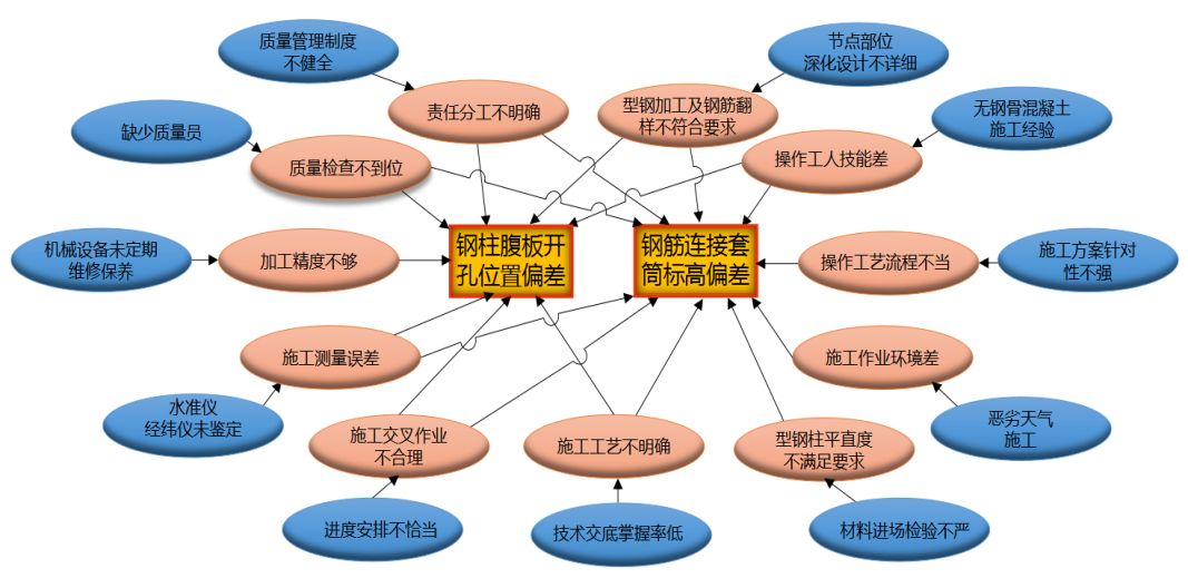 围绕“钢柱腹板开孔位置偏差”和“钢筋连接套筒标高偏差”两项主要症结,小组成员通过召开头脑风暴会议,深入探讨、详细分析类似工程的施工工艺要求,从“5M1E”6个方面进行分析,总结出各层级11项末端影响因素(如关联图所示)。