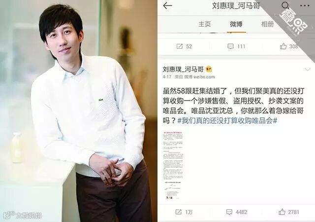 为了给自己正名,4月17日,聚美优品副总裁刘惠璞借58和赶集合并之机,发布了长微博要求涉嫌抄袭聚美优品文案的唯品会道歉,双方展开了口水战,刘惠璞在微博上提到虽然58赶集结婚了,但我们聚美真的还没打算收购一个涉嫌售假、盗用授权、抄袭文案的唯品会。借着58和赶集的合并讽刺抄袭,狠踩对手。