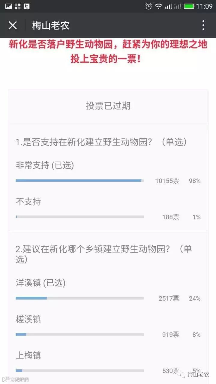 截止到7月22日23点55分,公众号梅山老农、新化人文《重磅:野生动物园能否落户新化,大家投票选址》微信网络点击量突破3万次,参与投票人数达近2万人次。后台共收到留言180余条,不仅反映出新化百姓对新建动物园的迫切需求,也表现出大家对家脱贫致富积极建言献策的澎湃热情。