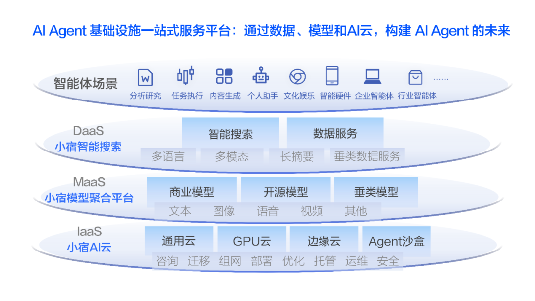 为打通 Agent 运行时“感知→收集→推理→反馈”全链路,小宿科技选择构建三层 AI 基础设施服务体系(IaaS + MaaS + DaaS):打造一个完整闭环,从底层 AI 云服务到中层模型服务,再到顶层的智能搜索与数据服务,层层协同、相互强化,最终形成一条面向 AI Agent 全生命周期的智能运行通路。