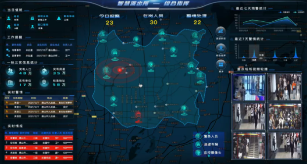 数智源智慧派出所可视化指挥平台就很好地展现了AR视频增强技术的能力,通过AR高点摄像机与增强现实技术相结合,标注辖区重点区域的建筑物、道路等主要信息,最后呈现在屏幕上的是一个实景地图的效果。平台还能通过GPS定位视频画面中警力位置,当遇到突发事件时可以快速利用视频画面定位警力所在位置进行调度指挥。