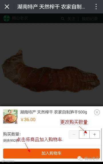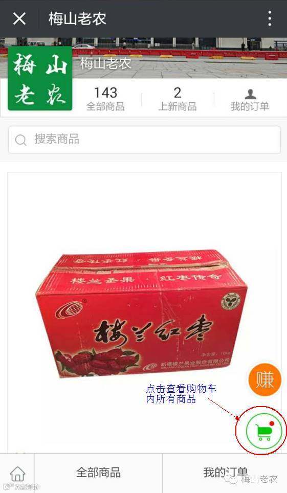 步骤:从梅山老农公众号选择进入商城首页,进入购物栏目区挑选商品