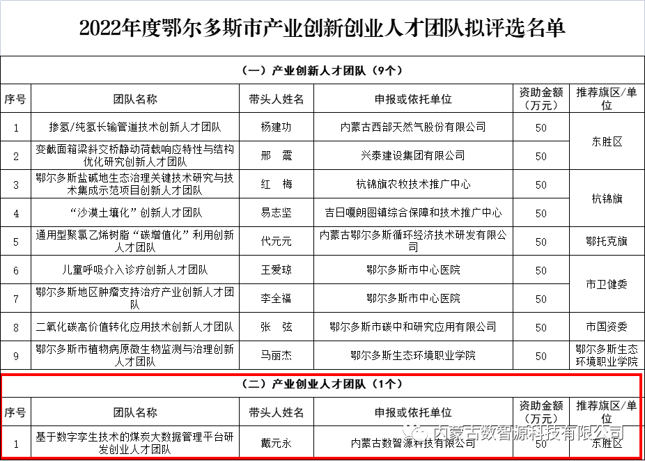 近日,中共鄂尔多斯市委员会人才工作领导小组办公室发布了《关于2022年度鄂尔多斯市乡村振兴专家人才工作站、鄂尔多斯市产业创新创业人才团队、高层次人才和人才团队滚动支持评选结果的公示》的公告,根据《鄂尔多斯市委市人民政府印发<鄂尔多斯市关于加强新时代人才工作助推高质量发展的若干政策>的通知》(鄂党发〔2021〕22号)及相关配套办法规定,经过单位推荐、资格审查、专家评审、实地考察、市委人才工作领导小组审定。内蒙古数智源科技有限公司“基于数字孪生技术的煤炭大数据管理平台研发创业人才团队”入选鄂尔多斯市产业创业人才团队。