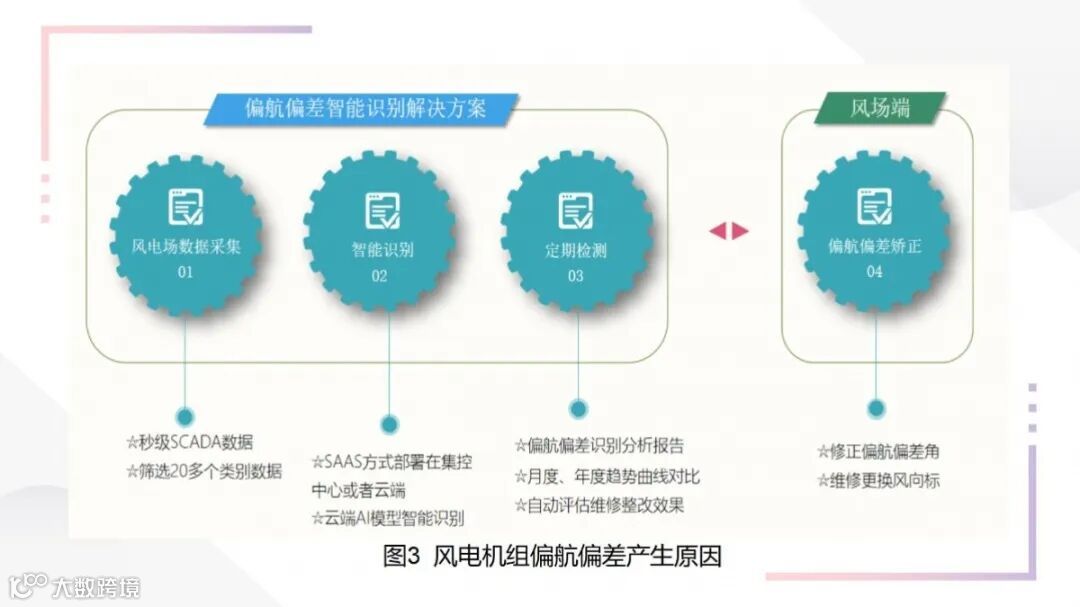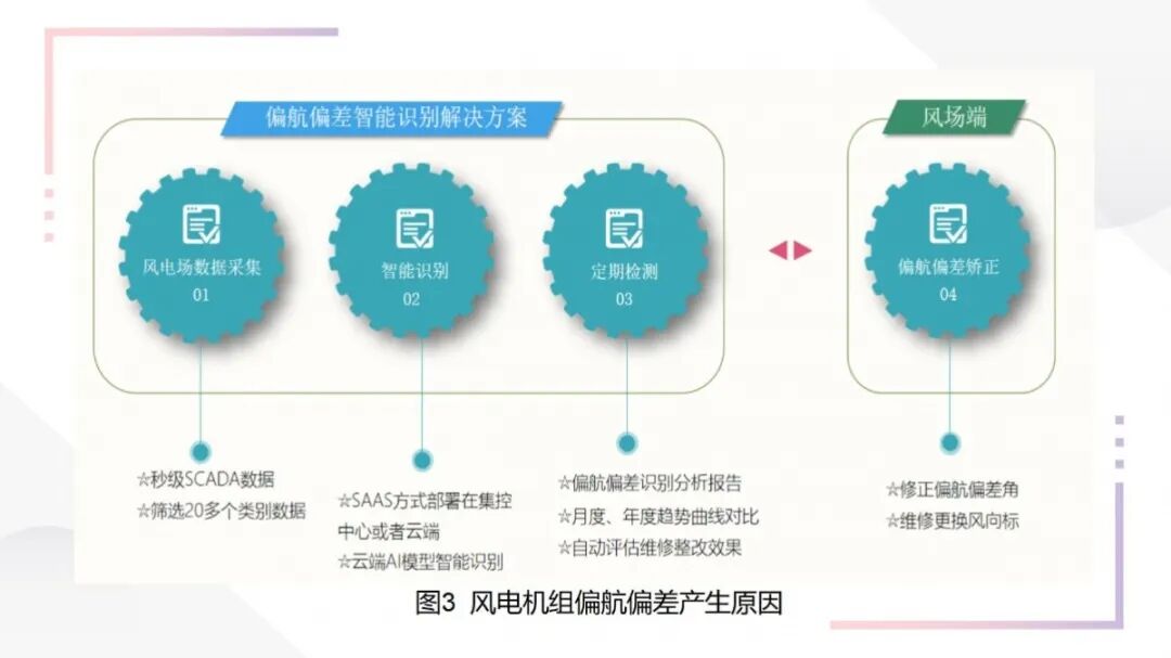 博数智源公司自主研发的“听风”系统,可以实现对风电场整体效能指标、偏航偏差识别、偏航系统劣化趋势预判等功能,监测画面使用不同颜色代表偏航偏差严重的程度。该应用系统可有效协助用户实时监测风场整体发电效能与偏航偏差程度诊断,也可对于选定时间段的机组进行偏航偏差结果的统计分析进而指导现场运维检修工作。该系统无需增加外部新增传感器,仅基于SCADA采集的大数据挖掘技术和深度理解风电运行原理即可完成对在役机组的偏航性能精准评估,为客户带来直观的发电量收益。