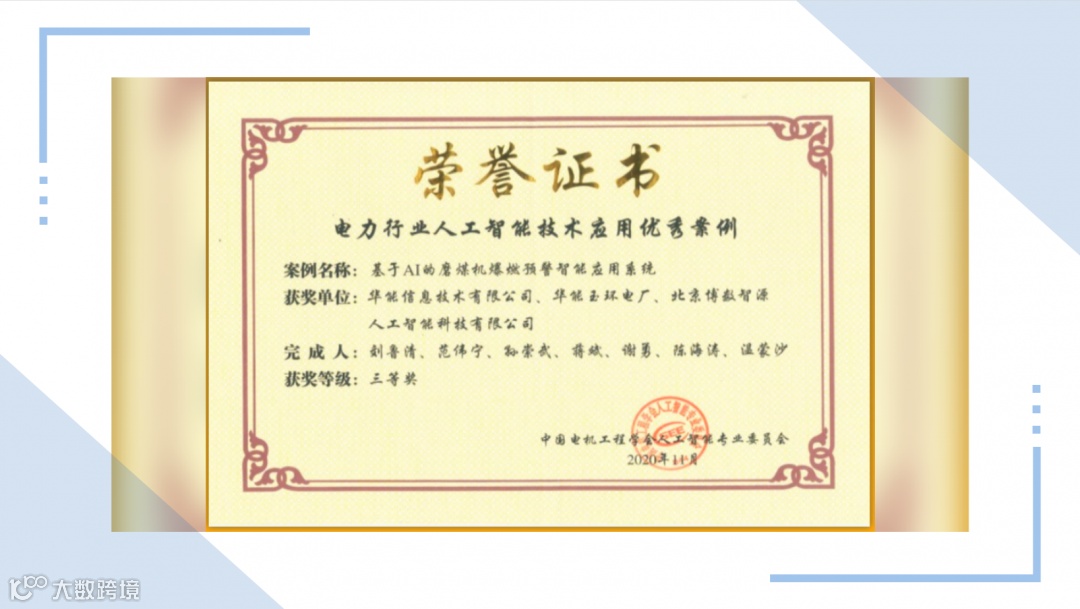 2020年11月,中国电机工程学会人工智能专业委员会举办了“2020年电力行业人工智能技术应用典型案例“的征集活动,旨在促进人工智能技术在电力行业中的应用,有力提升电力行业的智能化水平,加速人工智能技术与电力业务深度融合,推广成功解决方案,推进优秀成果转化。博数智源此次征集活动中,联合华能信息技术有限公司、华能玉环电厂荣获该活动的三等奖。