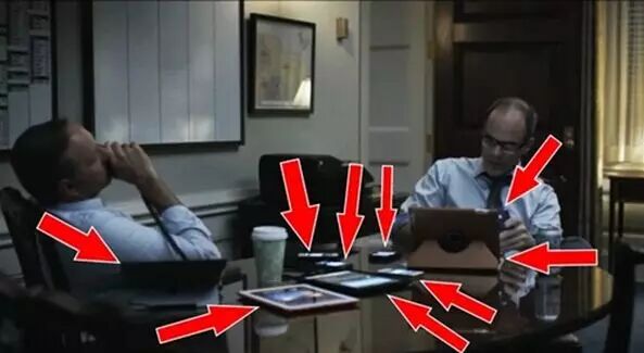 苹果这种逼格高的品牌也没少出现在剧集中,但是多数没有品牌商标之类的露出,不过大苹果不露Logo也能知道就是啦。最近比较"肆无忌惮"的当属《纸牌屋》了吧,苹果产品的出镜率似乎仅次于我们的男女主角。据网友统计第一季13集各类苹果产品出现两百多次,更有一个镜头桌上总共出现了九款苹果产品,全是产品摆拍的样子。