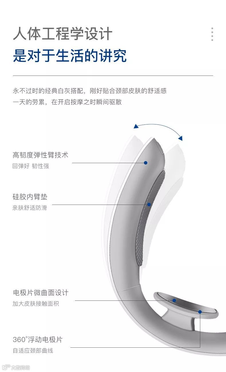 机身上的两个3D悬浮式电极片(浮动的椭圆形贴面),360°浮动无死角,全方位缓解脖子酸、麻、痛,按摩穴位更精准。