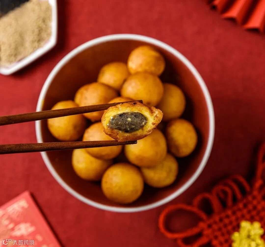 这款可以炸的汤圆又叫做炸金宵,专门为了炸而设计,新手也十分友好,炸起来不容易裂,在油锅里翻滚几分钟,直到表面金黄,一颗颗金灿灿的胖团子就出锅啦。