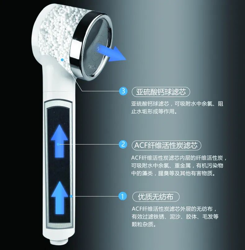 在这款花洒里面,装有亚硫酸钙球、活性碳纤维、PET无纺布。这三重过滤,能除去绝大部分杂质,从而软化水质,减少水垢。