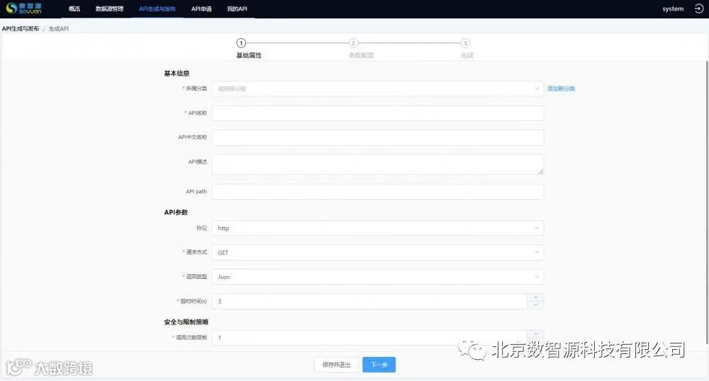 2、API生成。生成API需要填写API基础属性,并进行API参数配置。最后对生成的API进行测试,保障API的可用性。