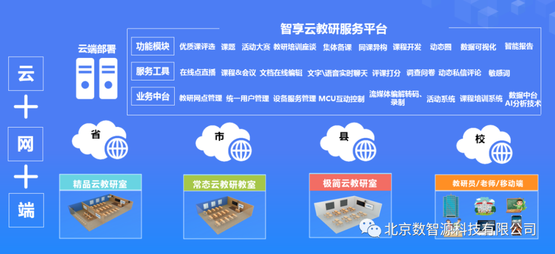 通过对我国教育资源现状及应用需求分析,数智源提出智享云教研解决方案,采用了云+网+端的部署架构,支持公有云、私有云、混合云灵活的部署方式,在云上部署智享云教研平台。平台着重于共享性,旨在提升教师教学能力,发展专业水平,通过组建网络研修共同体等方式,发挥名师名课示范效应,探索网络环境下教研活动的新形态,以优秀教师带动普通教师水平提升,使名师资源得到更大范围共享,促进教师专业发展。