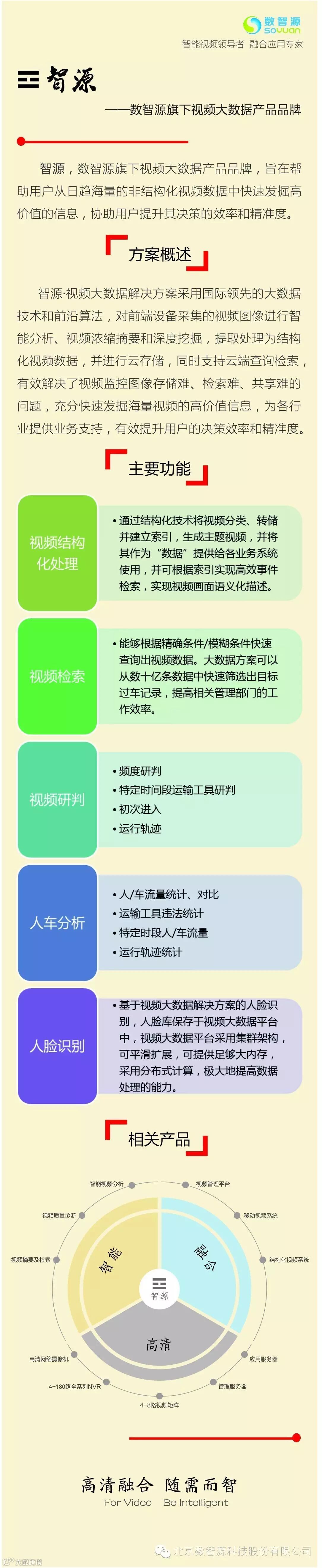 北京数智源科技有限公司在视频监控领域,高清化、大联网数据汇聚推动视频大数据形成,业务实战化推动大数据分析需求。如何从日趋海量的非结构化视频数据中快速发掘高价值的信息,协助用户提升其决策的效率和精准度,是视频大数据所关注的问题。