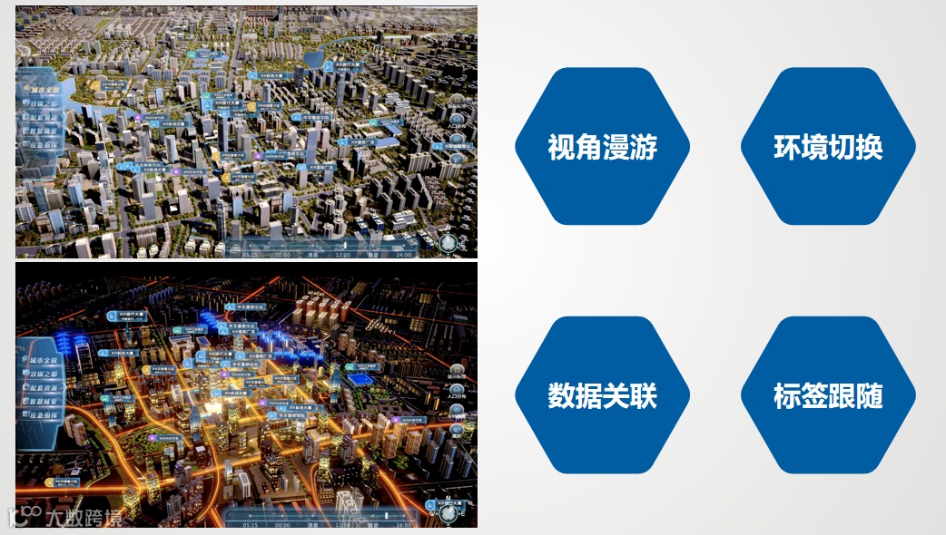 数字孪生:通过三维建模,实现白天与黑夜、阴晴雨雪等环境切换;通过对接监控摄像头画面,实现数据关联;视频标签可根据视角进行旋转、跟随;视角漫游可以更加直观地展示物理世界的全场景。