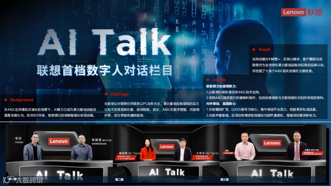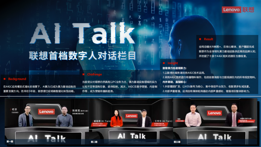 《AI Talk》数字人与真人对话栏目完成联想作为全球领先算力基础设施供应商的品牌认知,并挖掘了十余个AIGC相关的潜在生意线索。同时,也利用AIGC这个营销新工具探索出一条属于AI时代的营销新路径。