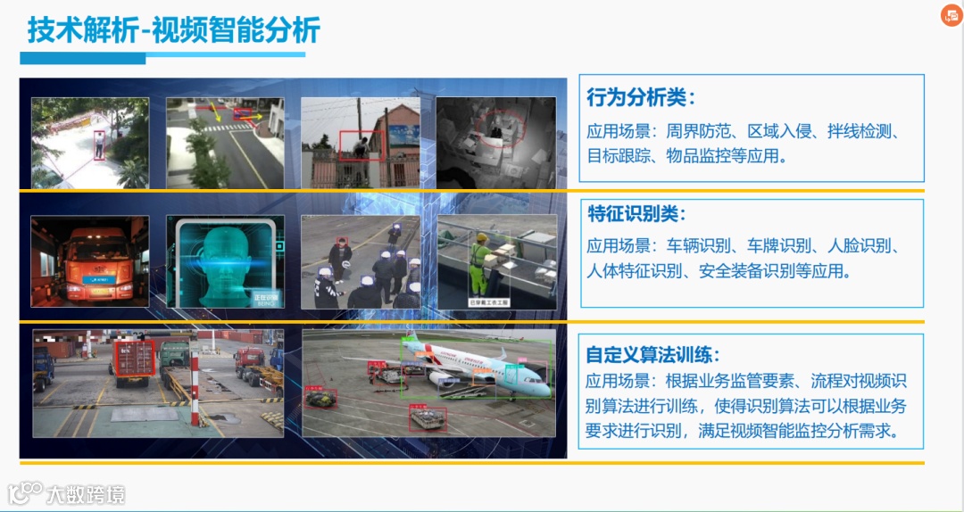 在视频AI方面,我们有通用的几十种算法,同时也为行业客户专门训练特有算法,比如我们为民航训练的算法,可以识别30多个节点;为监管训练了集装箱号识别,开箱、掏箱、关箱等职能算法,帮助客户实现非接触式监管;为矿山客户训练了安全监管的算法。这些算法在过去的实践中帮助客户实现数字化转型,把这些算法植入到视频后,把非结构化数据加工成结构化数据,再和业务数据融合应用。