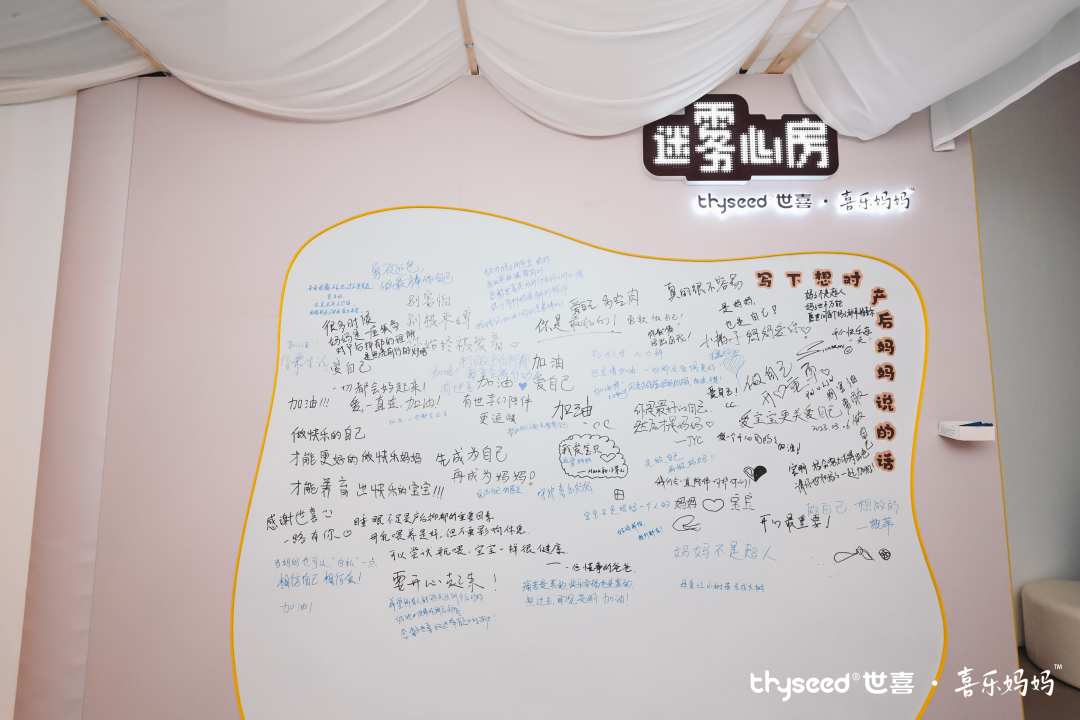 这种更具象化的实感体验,将“产后抑郁”这样的情绪化议题解读得更加具体。因为只有创造共鸣,才能更好地让大众关注到这个议题。现场有不少体验者,有所感有所思后,在展示墙上写下了发自内心的寄语。这种治愈感在不断传递,循环出了真正的“她力量”。