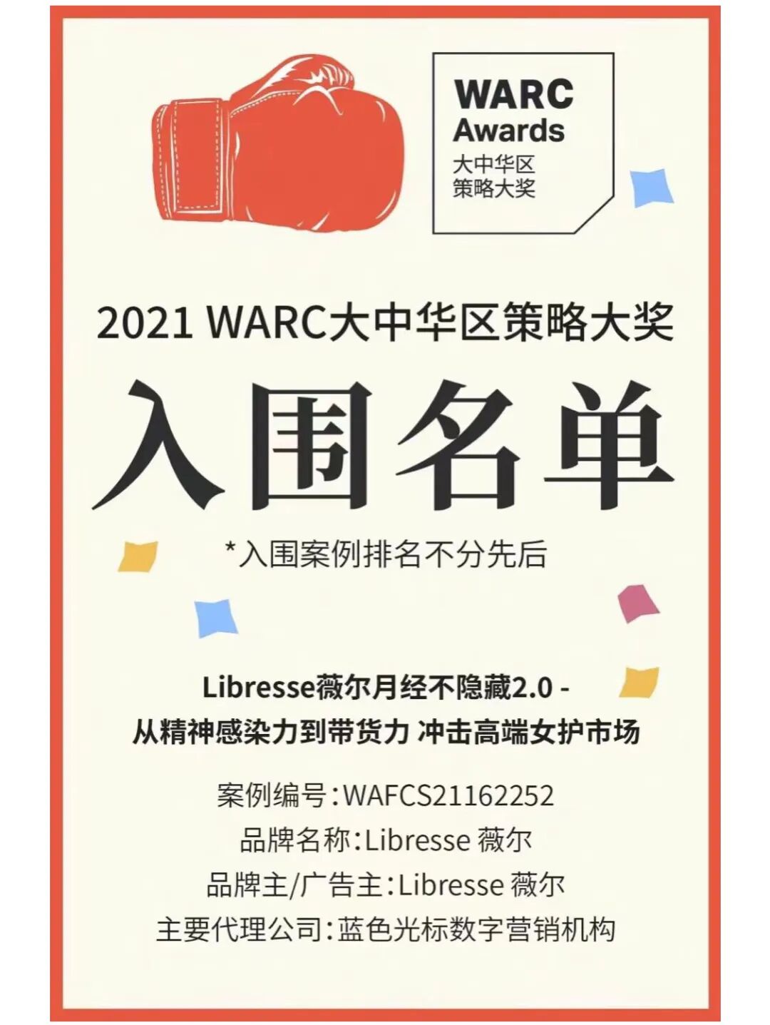 此外,历时几个月、经过三轮评审的激烈角逐后,“2021 WARC大中华区策略大奖”于上周末公布入围榜单,共有43个案例入围,其中,蓝标数字案例《Libresse薇尔月经不隐藏2.0态度营销》和《安居客-有些赛场,你不必是冠军》脱颖而出,入围本届大中华区策略大奖,最终获奖结果将在今年4月公布。