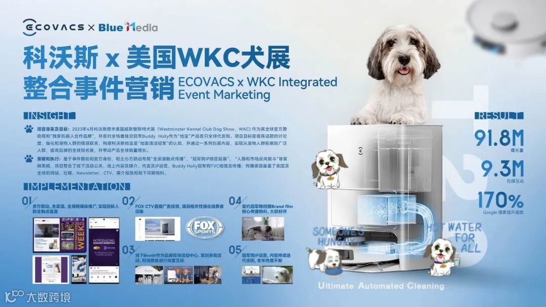 2023年4月科沃斯携手美国威斯敏斯特犬展(Westminster Kennel Club Dog Show,WKC) 作为其全球官方赞助商和“独家机器人合作品牌”,并签约全场最佳总冠军Buddy Holly作为“地宝”产品首只全球代言狗。本次传播目的是提高科沃斯话题讨论度、强化和宠物人群的情感联系、构建科沃斯地宝是“地面清洁冠军”的认知,并通过一系列创意内容,实现从宠物人群拓展到广泛人群,提高品牌的全球知名度,并带动产品全球销量增长。