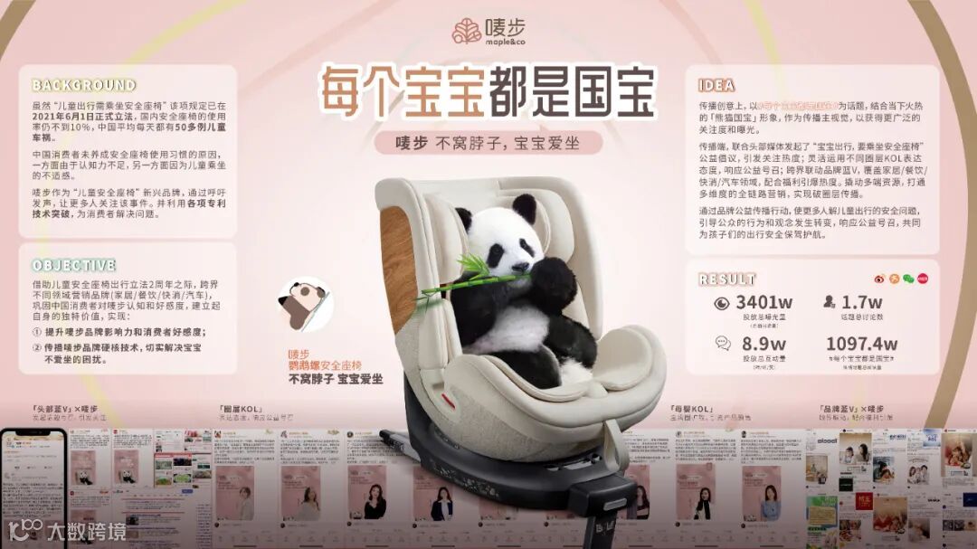 每个宝宝都是国宝,唛步不窝脖子,宝宝爱坐。传播创意上,以#每个宝宝都是国宝#为话题,结合当下火热的「熊猫国宝」形象,作为传播主视觉,以获得广泛的关注度和曝光。传播端联合头部媒体发起了“宝宝出行,要乘坐安全座椅”公益倡议,引发关注热度。撬动多端资源,打通多维度的全链路营销,实现破圈层传播。通过品牌公益传播,使更多人了解儿童出行的安全问题,引导公众的行为和观念发生转变,共同为孩子们的出行安全保驾护航。