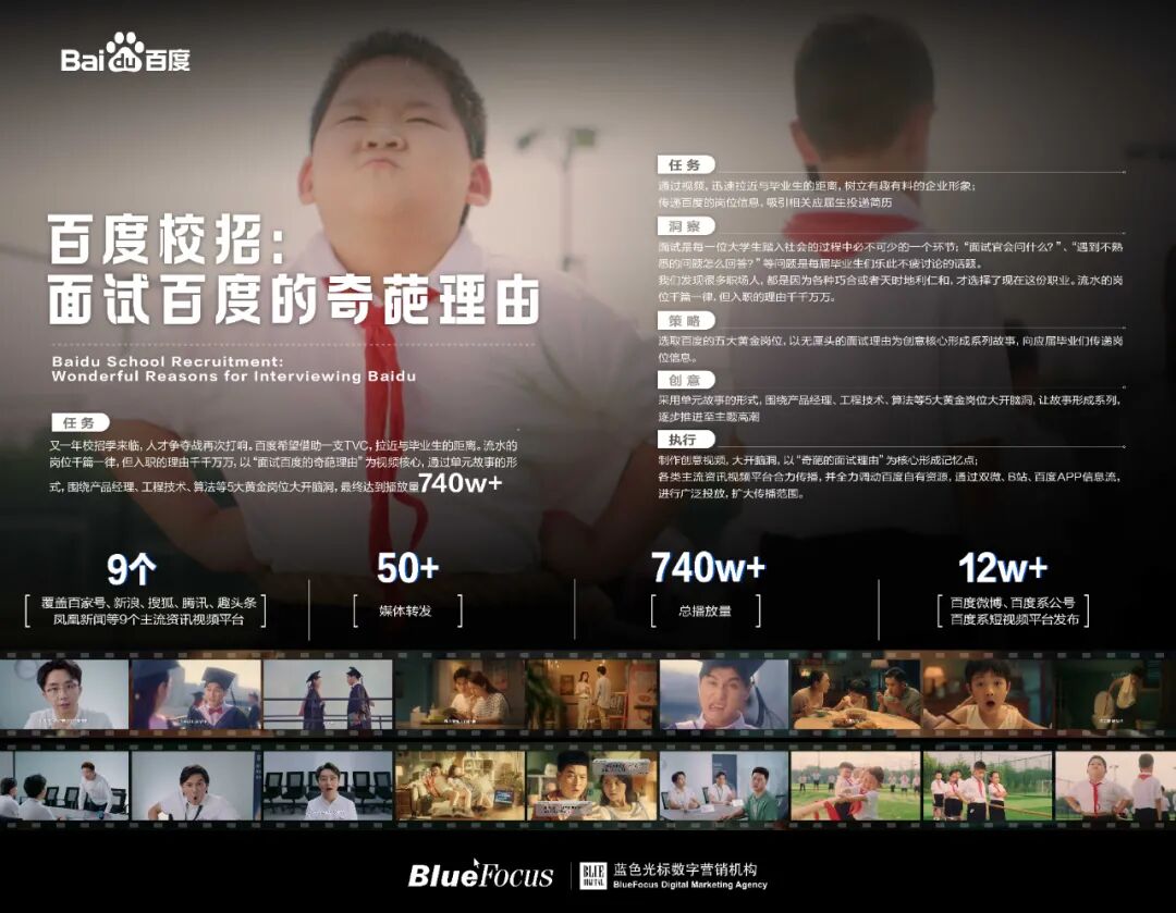 2020的校招季,人才争夺战再次打响。百度希望借助一支TVC,拉近与毕业生的距离,树立有趣有料的企业形象。如何打出百度的区隔?流水的岗位千篇一律,但入职的理由千千万万,以“ 面试百度的奇葩理由 ”为视频核心,通过单元故事的形式,围绕产品经理、工程技术、算法等5大黄金岗位大开脑洞最终达到了非常好的传播效果。