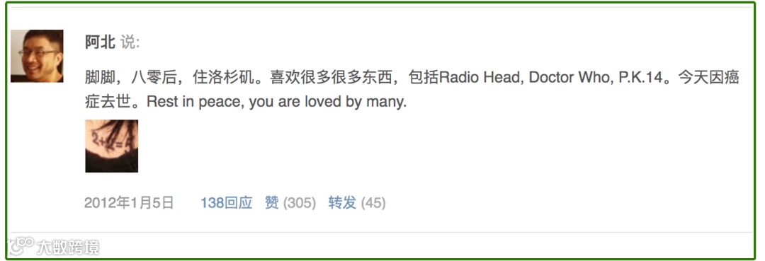 —— 以上就是这条悼念贴的全部内容。你无法得知他是个怎么样的人,只有点开链接,你才能感知到世界到底失去了一位怎么样的人。