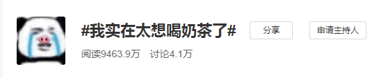 因为疫情,大部人“人群焦虑指数”直线上升,不管是精神上还是物质上都需要安抚和振作。但随着疫情的逐渐好转,喝奶茶、吃火锅成为网友的“疫后的第一思念”。#你多少天没喝过奶茶了#、#疫情结束最想吃什么#等,关于喝奶茶的多个社交话题均引发热议,形成现象级的传播。近日,#我实在太想喝奶茶#又一次上了热搜,获得了9000多万的话题阅读量。