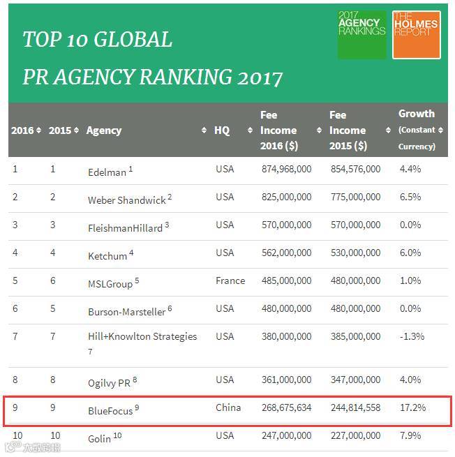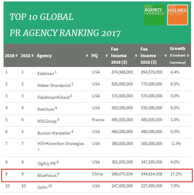 近日,全球权威公关行业资讯机构The Holmes Report发布了2017全球公关公司Top 10排行榜,蓝色光标凭借旗下境内外的公关业务再度位列第九,依然是唯一进入前十的中国本土营销企业。