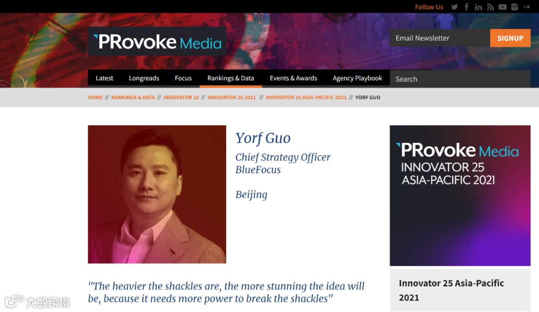 全球权威公关行业咨询机构PRovoke Media于去年底公布了2021 Innovator 25 Asia-Pacific榜单 ,蓝色光标数字营销机构首席策略官郭耀峰(Yorf )荣膺该项荣誉。