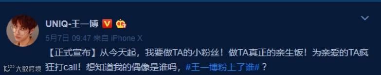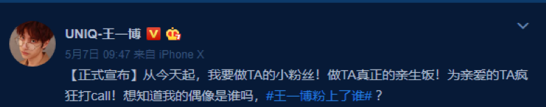 今年母亲节前夕,王一博突然更新动态,说自己粉上了一个偶像,要为偶像疯狂打call。粉丝们议论纷纷,各路吃瓜群众也赶来凑热闹。随着“王一博粉上了谁”悬疑事件不断发酵,一款专为中老年人群定制的奶粉——伊利欣活,强势借势饭圈玩法,调动年轻人群的热情,并引导粉丝为父母应援,在促进销售的同时,实现了伊利欣活品牌美誉度的提升。