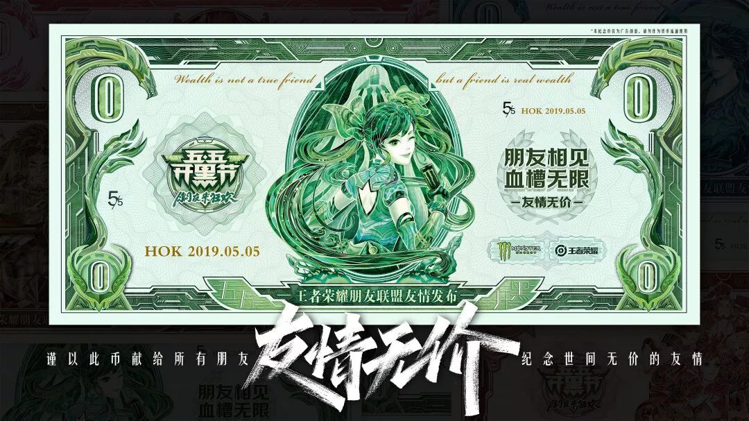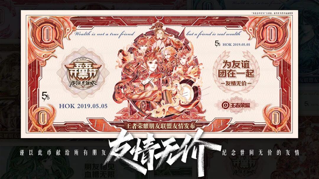 金钱几乎可以买到任何东西,却买不到真正的友谊。2019年,「五五开黑节」正式升级为「朋友开黑节」。为此,我们将王者荣耀游戏中的人物角色附于“钞票”之上,联合各大品牌发布一组「友情无价开黑纪念钞」,通过零元面额钞票,表达友情无价。在开黑节当天,引发自发创作,配合微博话题#朋友就要一起开黑#冲至热搜榜前三名。