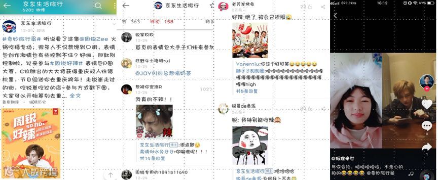 一是在节目本身的内容设置上,挖掘爱豆“新鲜人设”,面对挑战爱豆真实且有梗的反应总能触到粉丝的兴奋点。“朱星杰三天胖五斤魔鬼任务”、“周彦辰男友视角游迪士尼”,“周锐叫嚣吃辣无敌惨遭打脸”等的话题,无一例外地成功引发粉丝热情,成功实现明星超话这一粉丝聚集空间的刷屏讨论,话题度疯狂飙升;二则是节目传播上,深化互动机制。例如重庆站节目播出之前的12万转发解锁周锐高清无印剧照活动,一经发起便吸引以后援会为主导的热情参与,短短三天便完成任务,其单条微博的互动量达到13万,成为京东生活旅行官微单条微博互动量最高记录。三期节目下来,#《奇妙旅行局》#及明星分话题总阅读量超过1.2亿。