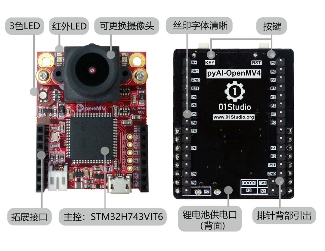 我们在基于OpenMV4原功能和外设不变的前提下,研发和设计了兼容pyBoard接口的转接板,优化了整体功能设计,并将其命名为:pyAI-OpenMV4。用户可以轻松使用MicroPython进行学习开发和项目应用。