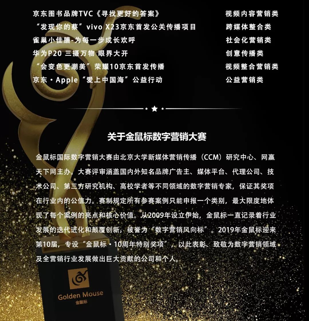 金鼠标国际数字营销大赛由北京大学新媒体营销传播(CCM)研究中心、网赢天下网主办。大赛评审涵盖国内外知名品牌广告主、媒体平台、代理公司、技术公司、第三方研究机构、高校学者等不同领域的数字营销专家,保证其奖项在行业内的公信力。赛制规定所有参赛案例只能申报一个类别,最大限度地体现了每个案例的亮点和核心价值。从2009年设立伊始,金鼠标一直记录着行业发展的迭代进化和颠覆创新,被誉为“数字营销风向标”。