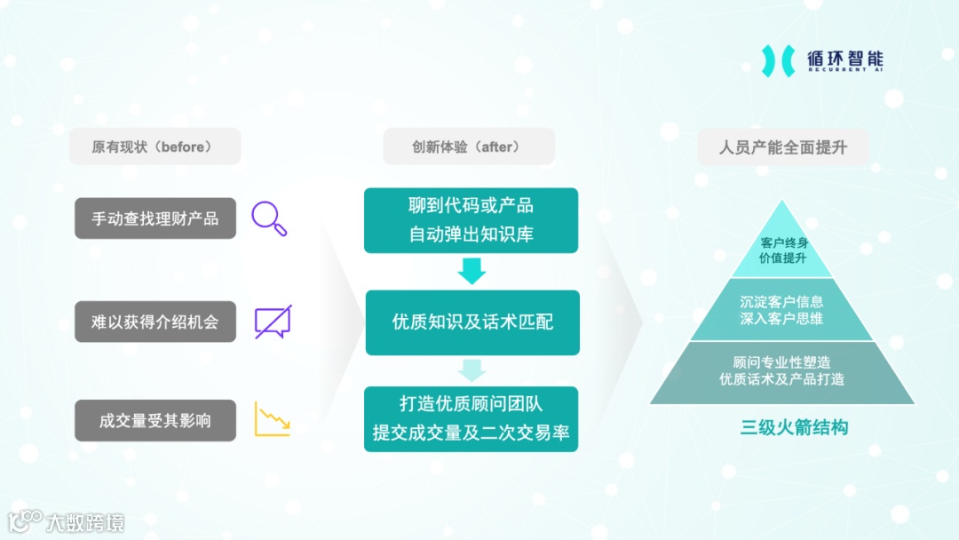 循环智能(Recurrent AI)是一家AI企业服务公司,专注于销售科技(SalesTech)领域。循环智能服务的客户主要在金融、房地产、汽车等领域,涵盖线上和线下沟通场景,致力于通过打开沟通过程的黑盒,赋能一线业务人员、销售管理和客户洞察,让企业与客户的每一次沟通有更好的成效。