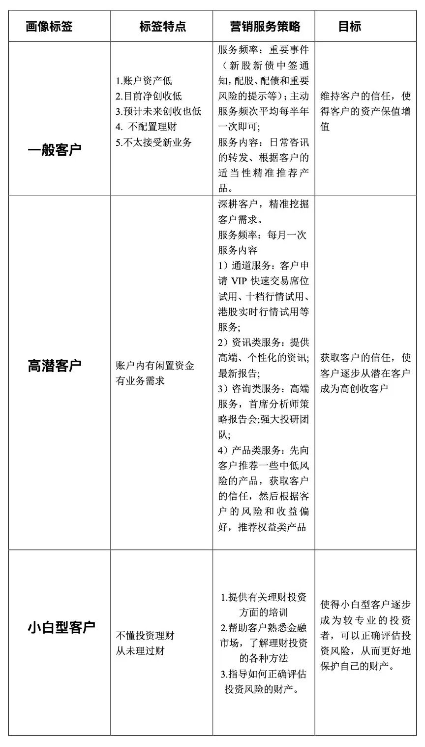 3. 是否对一些具有服务策略标签的客户进行了分层以及更具有针对性的服务。例如,有的客户是小白型客户,那么就不能采用像服务有经验的投资者那样的服务策略,而是要进行更多的投教以及基础金融知识的讲解和投资理念的引导。
