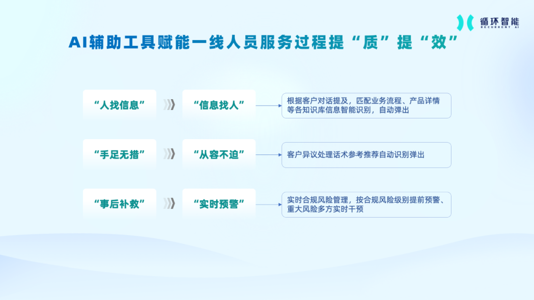 循环智能(Recurrent AI)是一家AI企业服务公司,专注于销售科技(SalesTech)领域。循环智能服务的客户主要在金融、房地产、汽车、教育培训、B2B企业服务等领域,涵盖线上和线下沟通场景,致力于通过打开沟通过程的黑盒,赋能销售管理、一线业务人员和客户洞察,让企业与客户的每一次沟通有更好的成效。作为国内应用领先的Al+销售科技公司,循环智能为企业提供从全渠道沟通数据采集到录音转写、内容挖掘、NLP语义建模、会话分析洞察和沟通实时辅助的完整解决方案,通过“AI能力+软件+硬件+内容”的端到端服务助力企业客户成功。