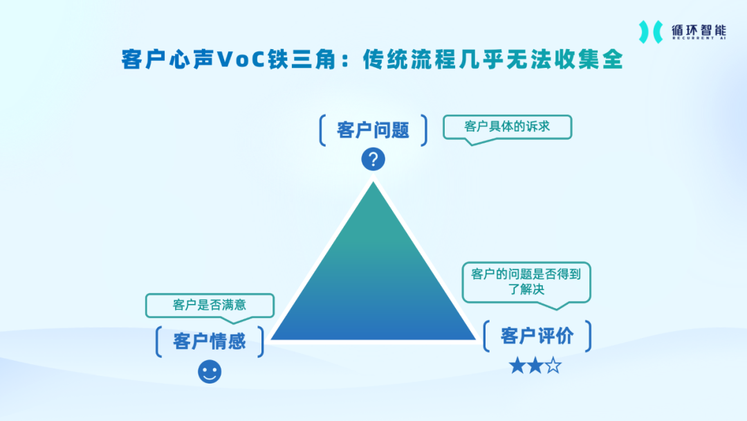 从企业管理和运营的角度看,其实比客户评分更重要的是客户提了什么问题,在服务过程中有没有得到解决,这样才能找到提升客服质量的抓手,但传统技术很难做到。基于循环智能的千循大模型等AI大模型技术,企业可以得到更加完整的VoC铁三角信息: