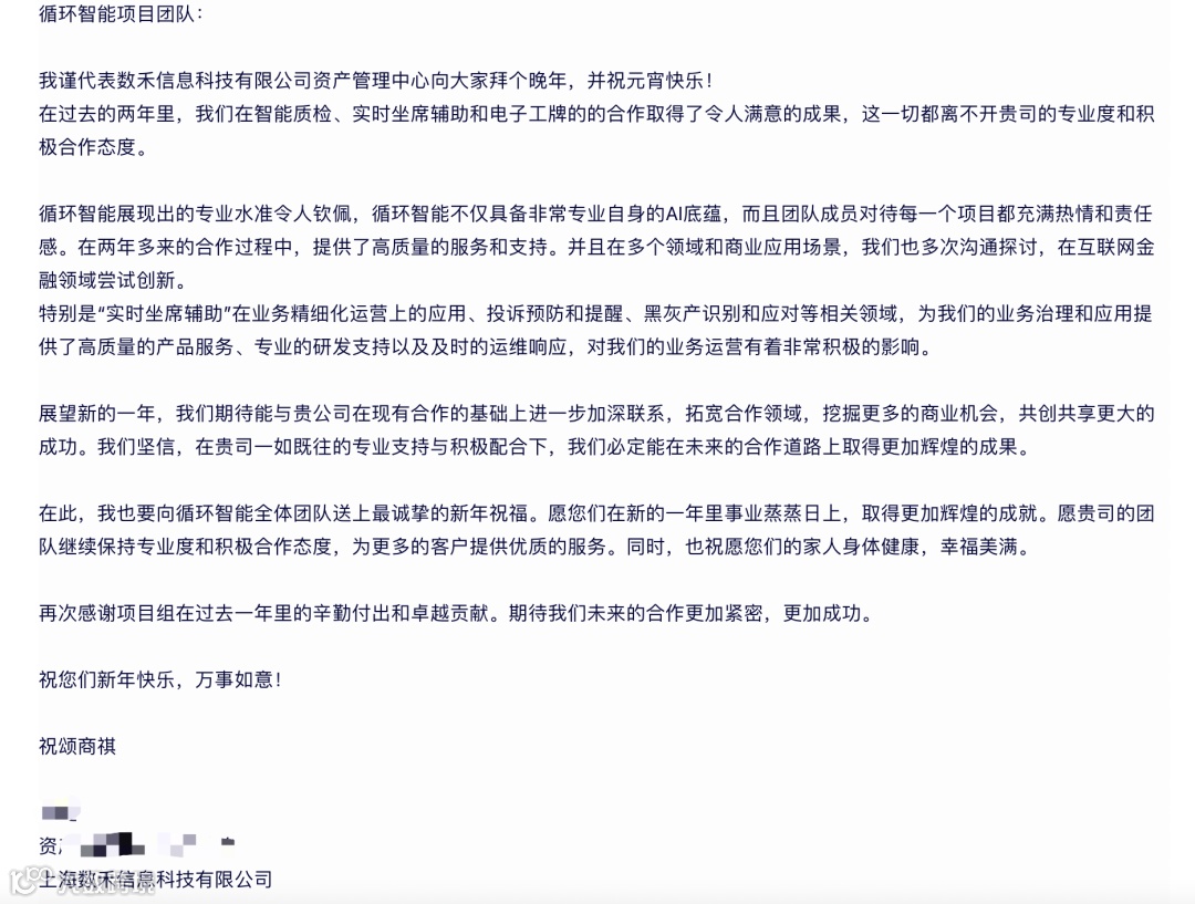 “ 在过去的两年里,我们在智能质检、实时坐席辅助和电子工牌的合作取得了令人满意的成果,这一切都离不开贵司的专业度和积极合作态度。循环智能不仅具备非常专业资深的AI底蕴,而且团队成员对待每一个项目都充满热情和责任感。在两年多来的合作中,提供了高质量的服务和支持,并且在多个领域和商业应用场景,我们也多次沟通探讨,在互联网金融领域尝试创新。”