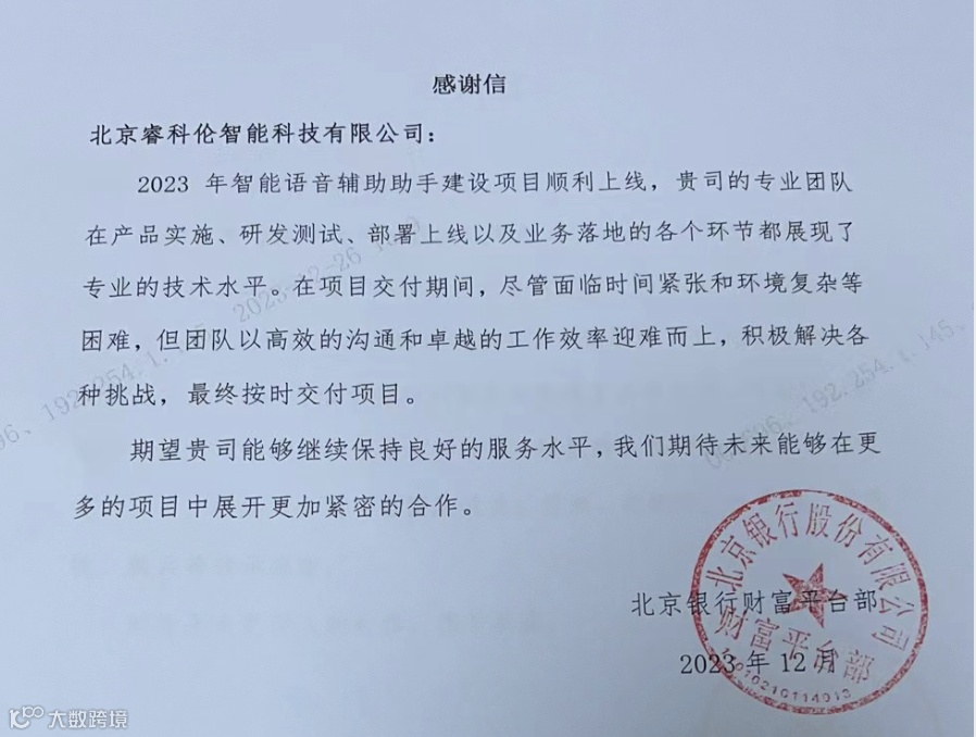“ 2023年智能语音辅助助手建设项目顺利上线,贵司的专业团队在产品实施、研发测试、部署上线以及业务落地的各个环节都展现了专业的技术水平。在项目交付期间,尽管面临时间紧张和环境复杂等困难,但团队以高效的沟通和卓越的工作效率迎难而上,积极解决各种挑战,最终按时交付项目。”