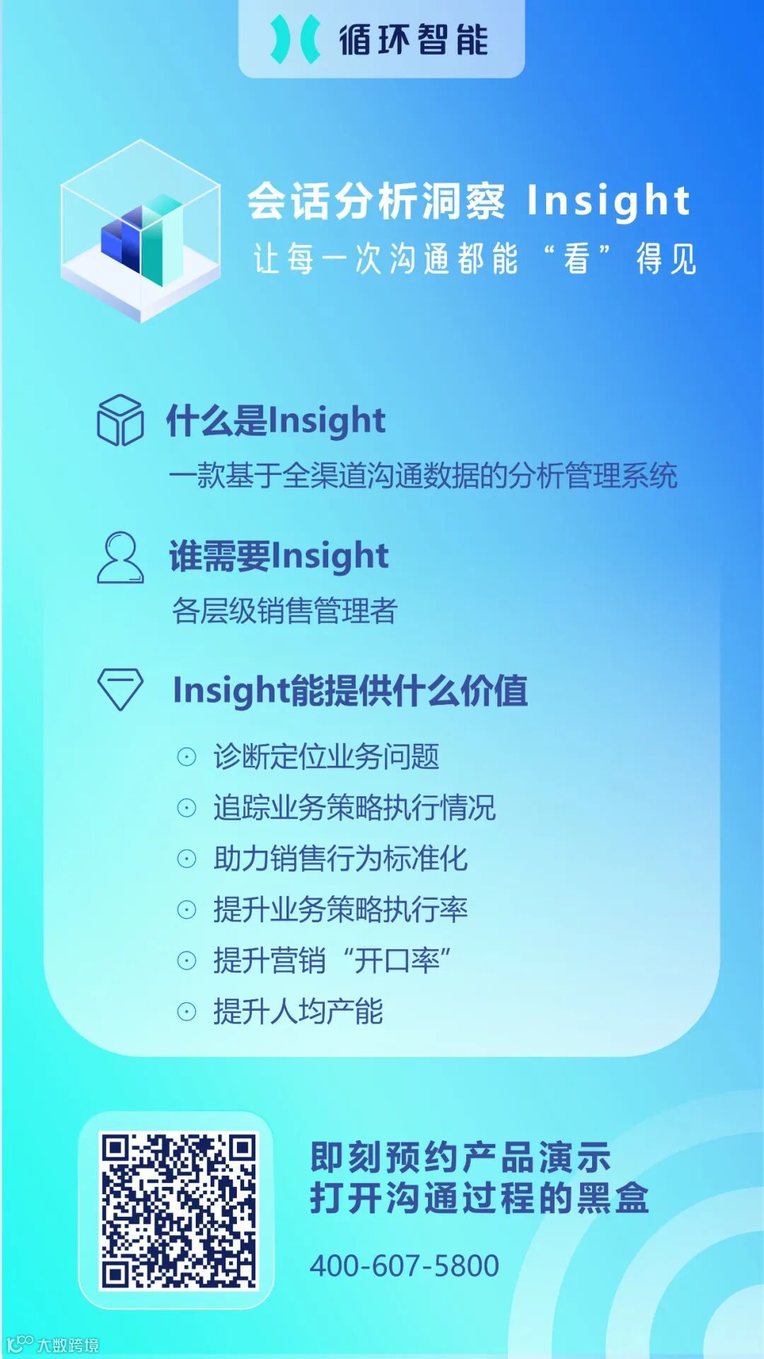 作为循环智能“业务增长型”产品矩阵的主力,“会话分析洞察Insight”致力于成为新一代销售管理利器,帮助销售管理者打开销售人员与客户之间沟通内容的黑盒,通过可视化的看板,实现对沟通内容的洞察和分析,精细化诊断业务问题、全景式追踪业务策略执行情况。