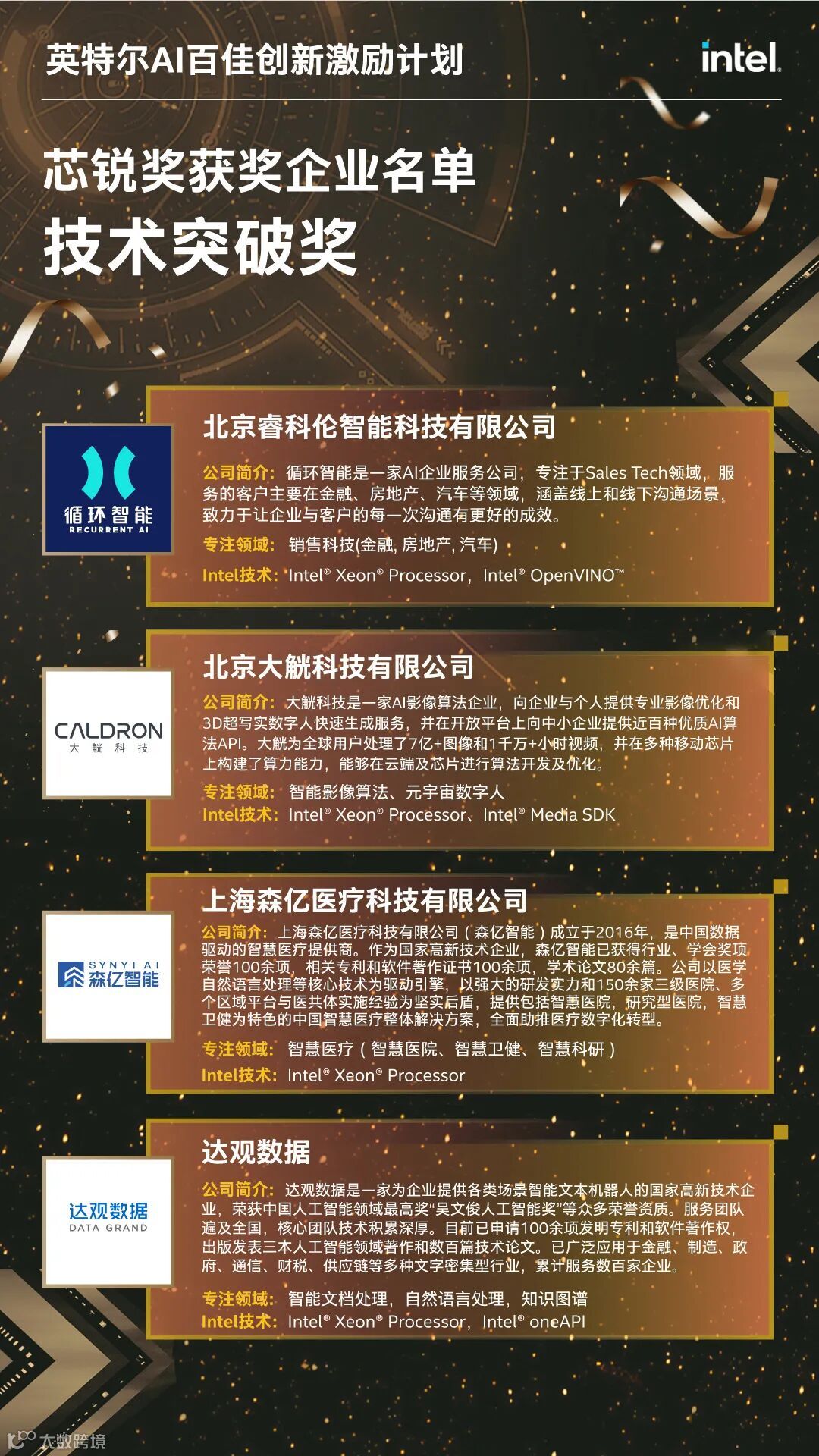 其中,技术突破奖用于鼓励那些采用最新的技术,通过突破性的创新,结合自身敏锐的市场洞察和方案拓展融合能力,加速客户数字化转型进程的创新企业。本届技术突破奖的获得者是:北京睿科伦智能科技有限公司(循环智能)、北京大觥科技有限公司、上海森亿医疗科技有限公司和达而观科技(上海)有限公司。