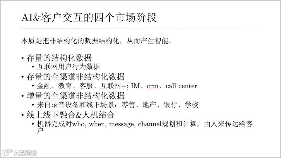 3. 第三个阶段是增量的全渠道非结构化数据:这个阶段就是将线下场景囊括进来,比如线下的面对面销售过程、银行柜员与客户沟通的过程等。