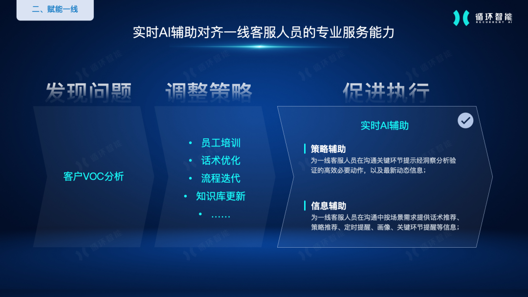 循环智能(Recurrent AI)是一家会话智能和私域大模型产品及解决方案提供商,致力于让企业与客户的每一次沟通有更好的成效。循环智能借助领先的自然语言处理、语音识别、机器学习、AI大模型等核心技术开发了销售会话洞察、客户心声分析、智能辅助系统、智能合规质检和智能工牌等产品,在银行、保险、证券、汽车、零售、房产、教育、消费金融、B2B等行业得到广泛应用。循环智能的产品和解决方案致力于赋能一线业务人员、客户洞察、销售过程管理,帮助企业降本增效,获得新增长。