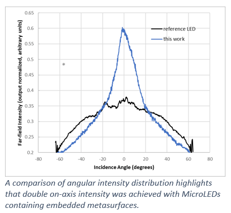 集成超表面的MicroLED实现了轴向发光强度提升一倍(图片来源:Lumileds)