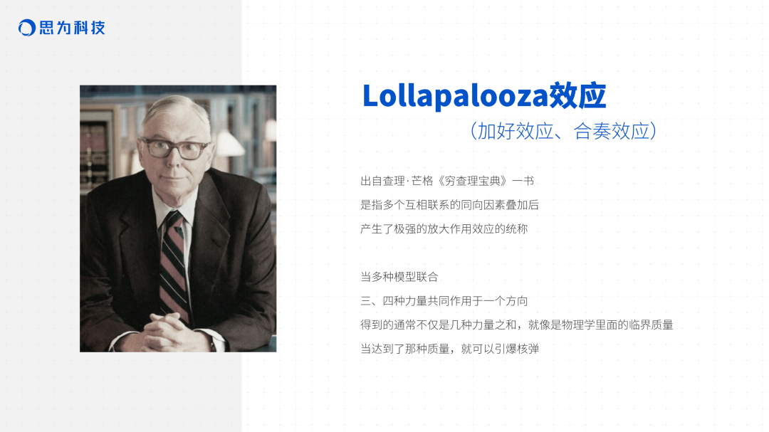 lollapalooza,译为加好效应,合奏效应。出自查理·芒格《穷查理宝典》一书,是指多个互相联系的同向因素叠加后,产生了极强的放大作用效应的统称。当多种模型联合,三、四种力量共同作用于一个方向时,得到的通常不仅仅是几种力量之和,就像是物理学里面的临界质量,当达到了那种质量,就可以引爆核弹,如果没有达到那种质量,可能什么也得不到。