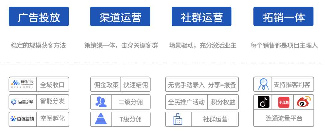 拓销一体:今天置业顾问所拥有的能力已经远非之前可比:顾问可以做内容,做投流,做自己微信的私域运营。我们的系统需要支持抖音、小红书、微博等多域流量的接入,认定拓销一体,拉通全域客户数据。