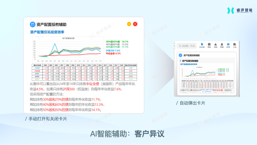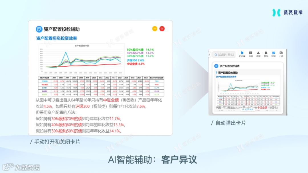 循环智能的智能辅助帮助券商的财富管理业务朝向数字化、集约型的分客群经营模式转变,使得投资顾问能够更好地理解客户的需求和风险偏好,并提供个性化的投资建议和资产配置方案,从而真正地践行“三分投、七分顾”的理念,帮助客户提高决策效率,不断提升客户体验。